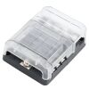 Kompakter Plus/Minus-Stromverteiler. Ausgerüstet mit 6 Plus-Ausgängen (M4) sowie einer Masseverteilung. Die Stromzuführung erfolgt über je einen Zentraleingang (M5). Ist eine Sicherung defekt, wird dies durch eine LED angezeigt. Lieferung ohne Sicherungen.